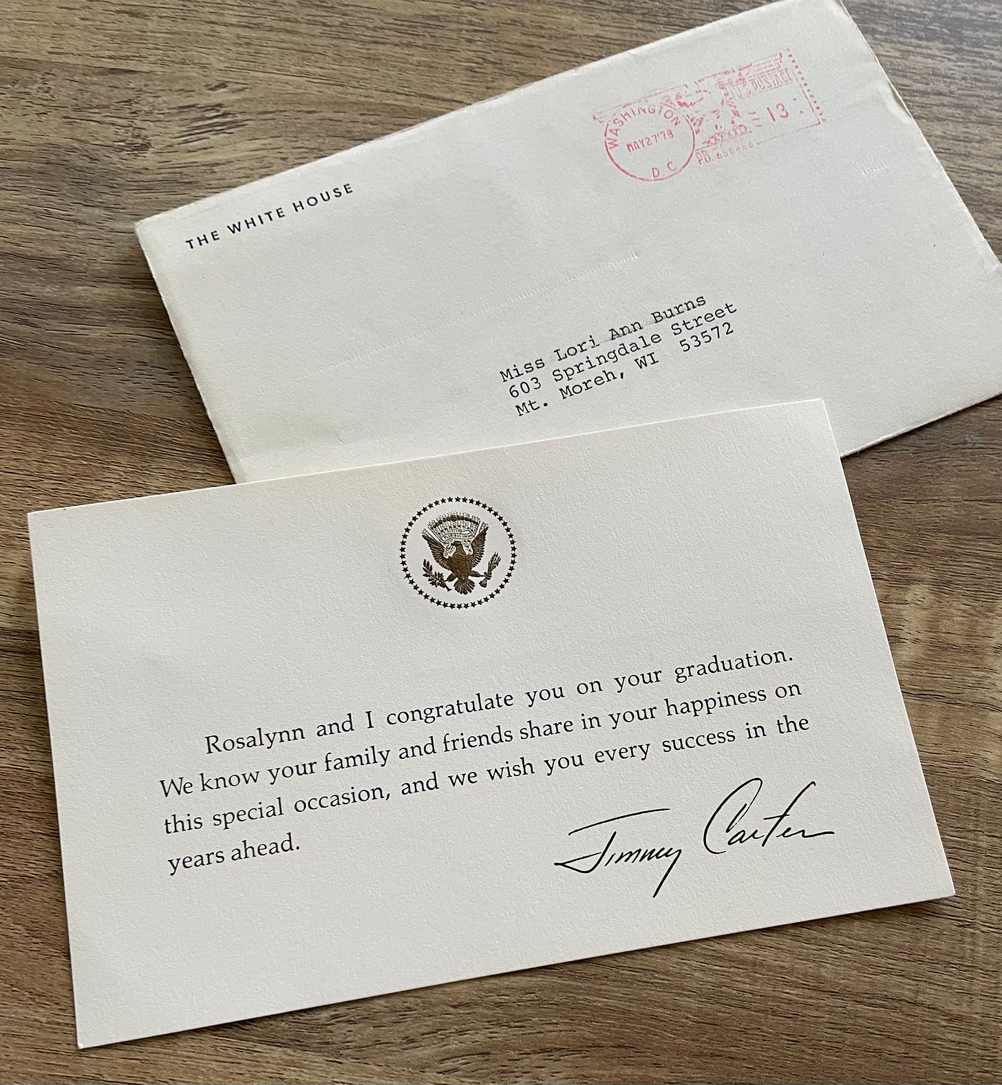 As a high school senior in Mt. Horeb, Wisconsin in 1978 my friend and I found ourselves with extra graduation announcements. We decided it would be fun to send them to famous people. Dopey teenagers. I only received one response. I can’t even remember who the others were. Athletes? The Governor of Wisconsin? Who knows. What I do know is that I only received one response. God Bless Jimmy Carter.